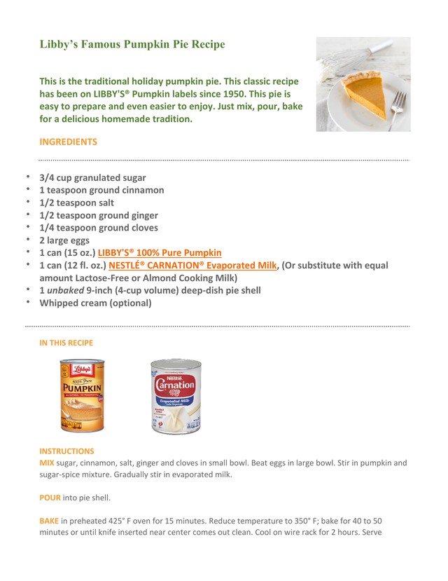 Recipe for Libby's Famous Pumpkin Pie