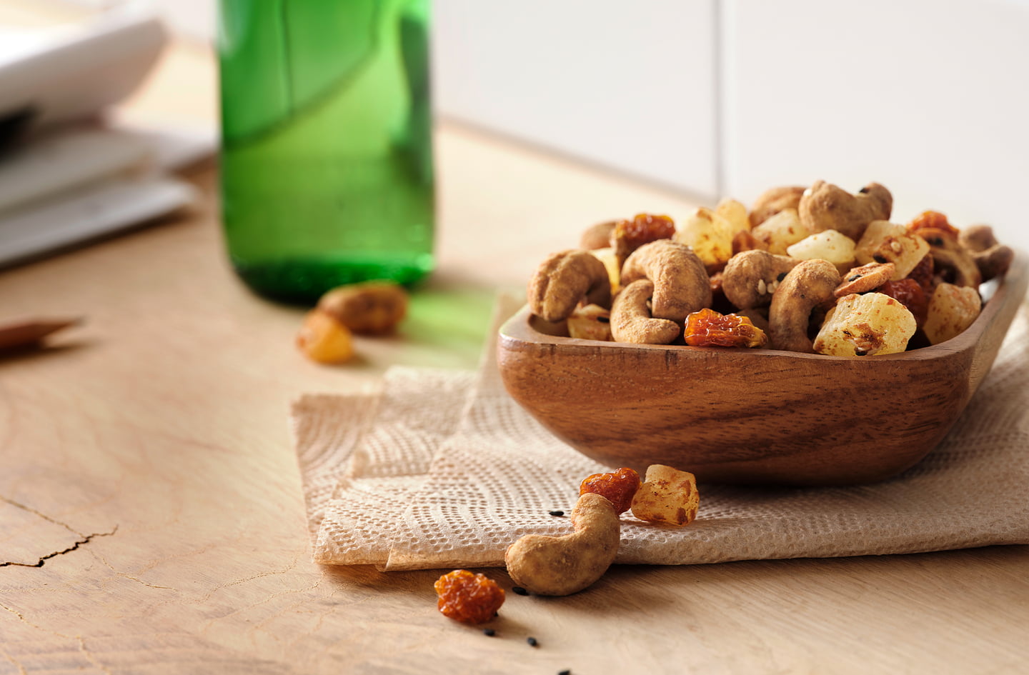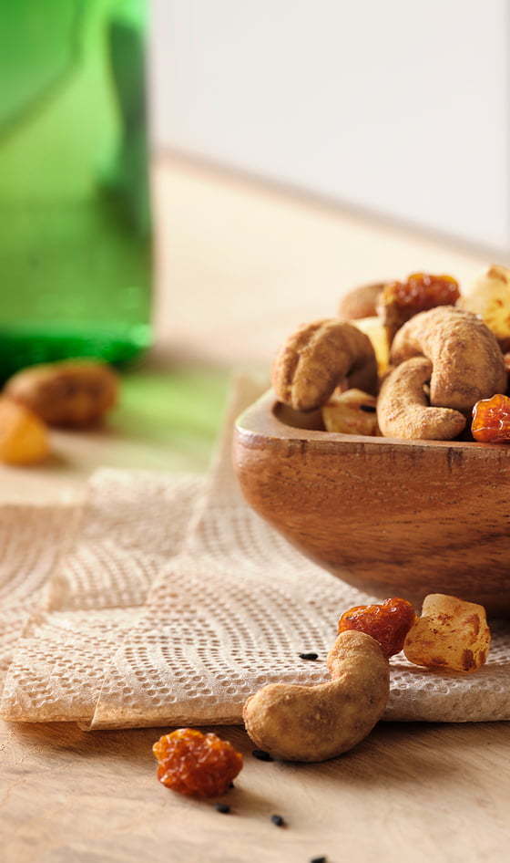 PINEAPPLE CHILI CASHEW GLAZED MIX A sweet and spicy mix of creamy cashews, dried pineapple, tangy dried goldenberries and crunchy sesame seeds all glazed with a chili seasoning & coconut sugar.