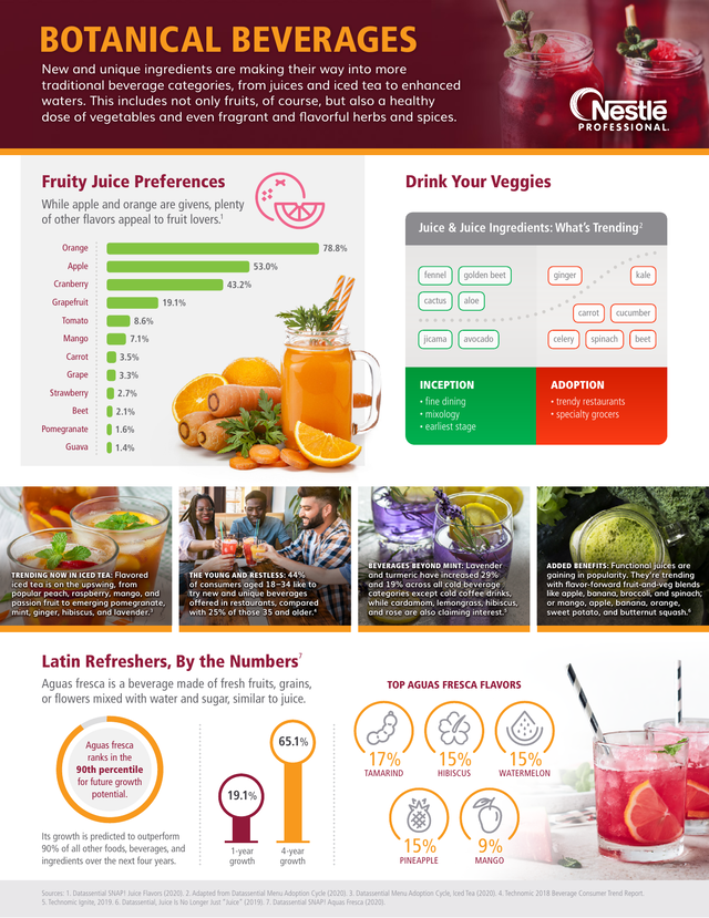 While craveability is a key attribute for beverages, other important drivers help build appeal for the category too, from health and wellness to quality and unique flavor infusions. Meanwhile, flavors and ingredients are getting downright exciting. In addition to more expected tropical and global influences, some of the hottest food ingredients over the past few years—think ginger, cilantro, shishito peppers, yuzu kosho, gochujang, seaweed, cayenne, and harissa—are finding momentum in adult and specialty nonalcoholic beverages.